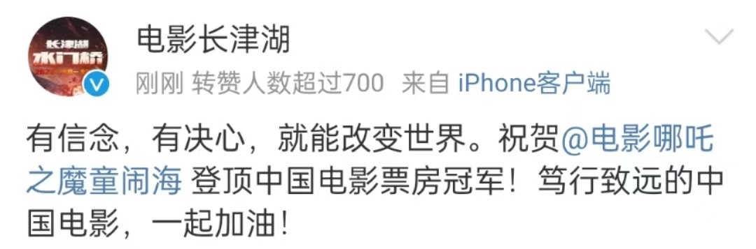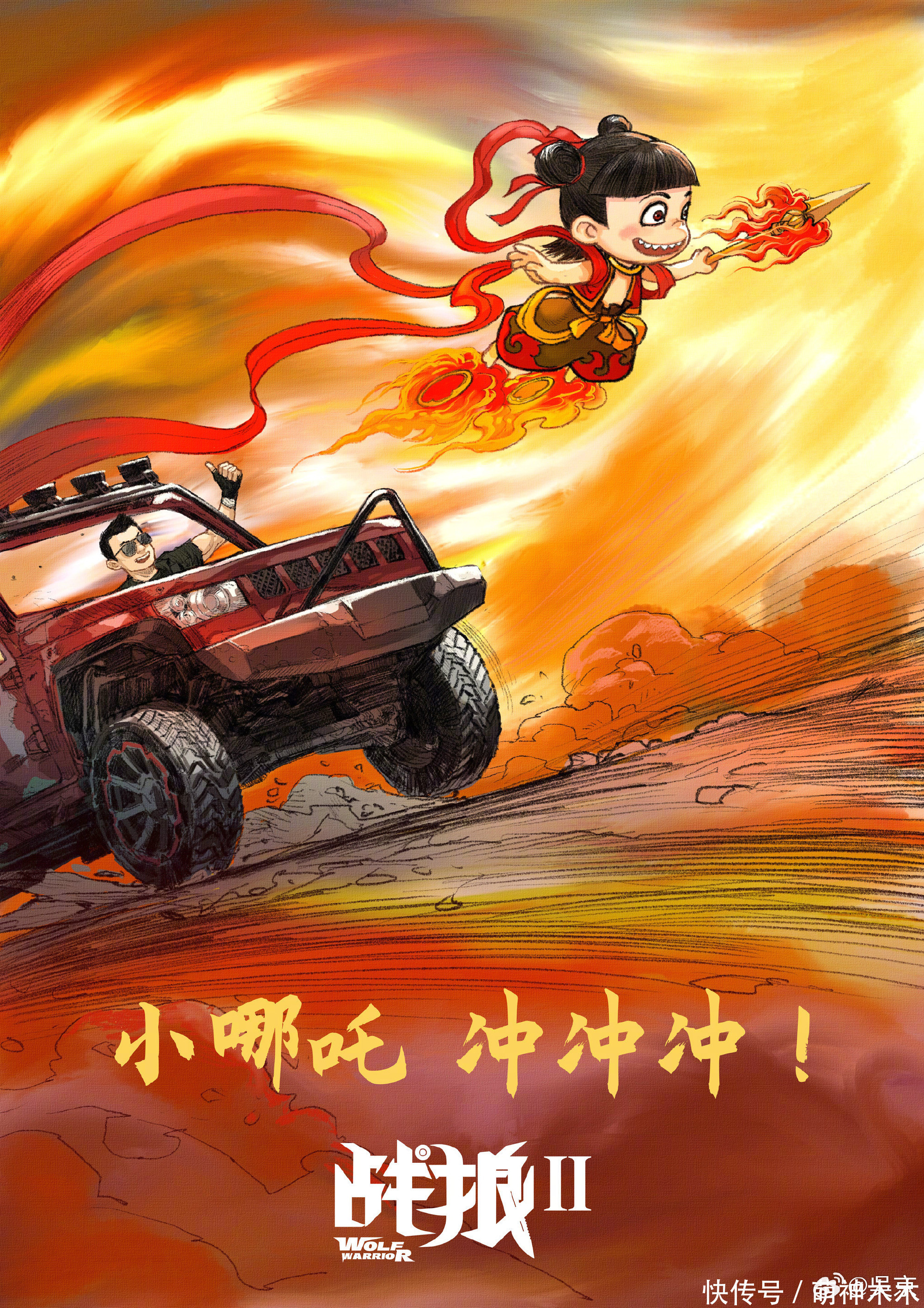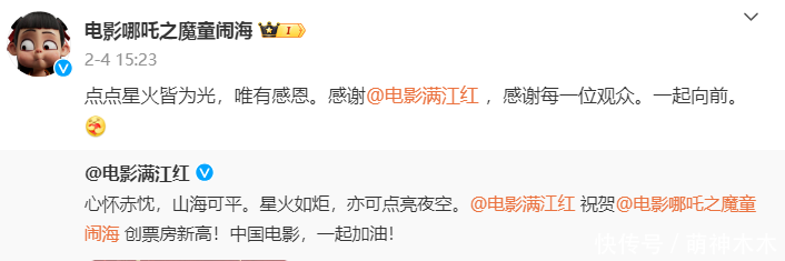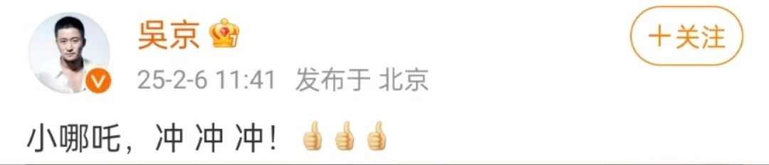 最认真的当属《战狼2》官方,在票房还未超过前,突然注册了某短视频平台账号,疑似为了方便给《哪吒2》发贺图,随后《战狼2》就发来祝贺图,主演吴京配文“小哪吒,冲冲冲”。