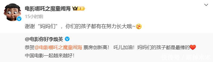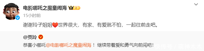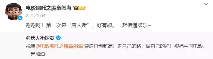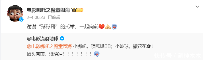 《流浪地球》官博卖萌鼓励哪吒向前冲,《哪吒》官博也感谢“球球哥”的托举。