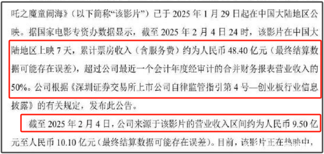 《哪吒2》的票房走势一直给人惊喜。据光线传媒公告,《哪吒2》自上映以来的票房收入已经超过该公司最近一个会计年度经审计的合并财务报表营业收入的50%,公司从该影片获得的营业收入区间约为人民币9.50亿元至10.10亿元。
