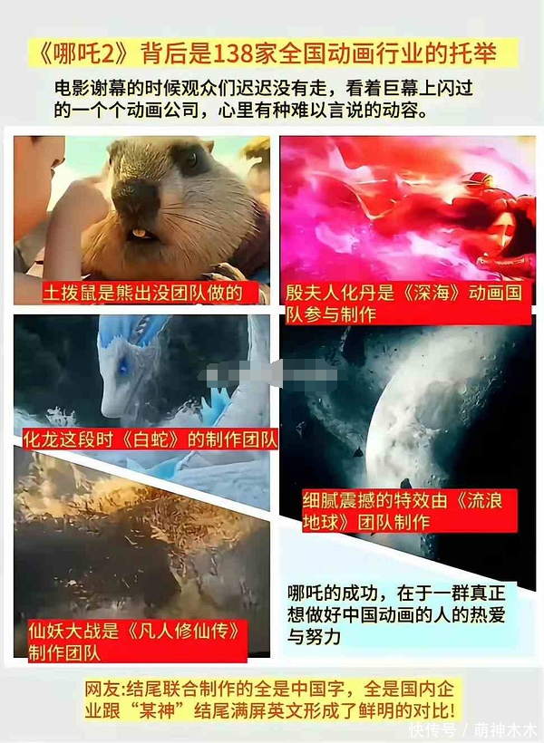 网传可爱的“土拨鼠”、“神似光头强的陈塘关士兵”等都是熊出没团队制作,《深海》的红极动画团队分享了离子水墨渲染技术,还有大家熟悉的《白蛇》、《流浪地球》等特效团队,他们都是《哪吒2》成功的幕后功臣,说一句全行业托举不过分。